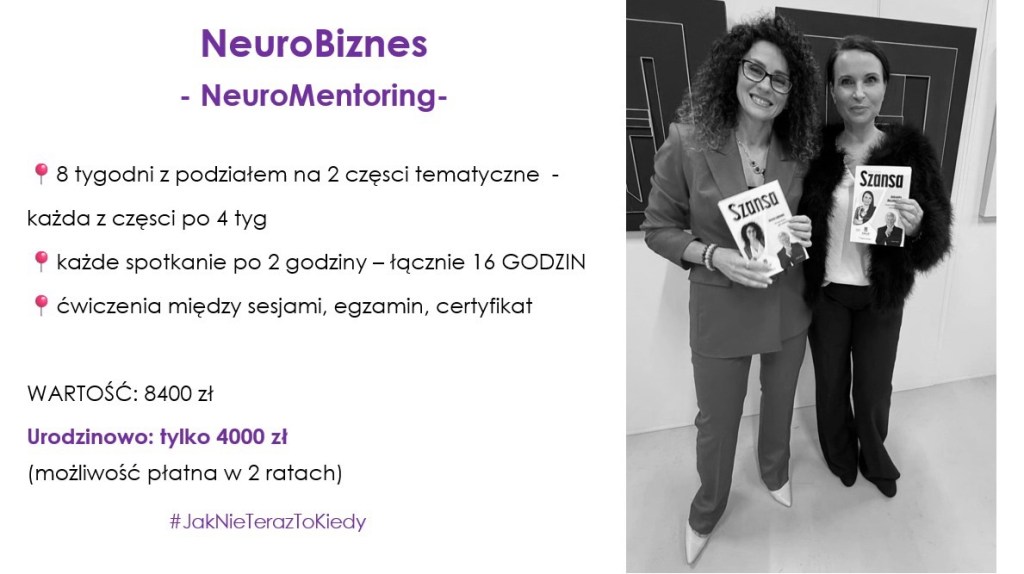 Zapraszamy Cię na 8 tygodniowy program NeuroBiznes, w którym pokażemy Ci, jak z wykorzystaniem swojego potencjału robić biznes w zgodzie ze sobą, jak mieć wyniki, o jakich marzysz, jak ustawić swój mental na rezultat, jak pracować z rezultatem, jak go zmierzyć i jakimi strategiami dopasowanymi do siebie go osiągnąć.