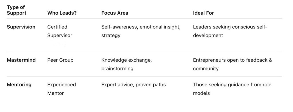 While it’s rooted in models used in psychology and coaching, business supervision applies specifically to leadership, strategy, decision-making, and self-awareness in a business context.